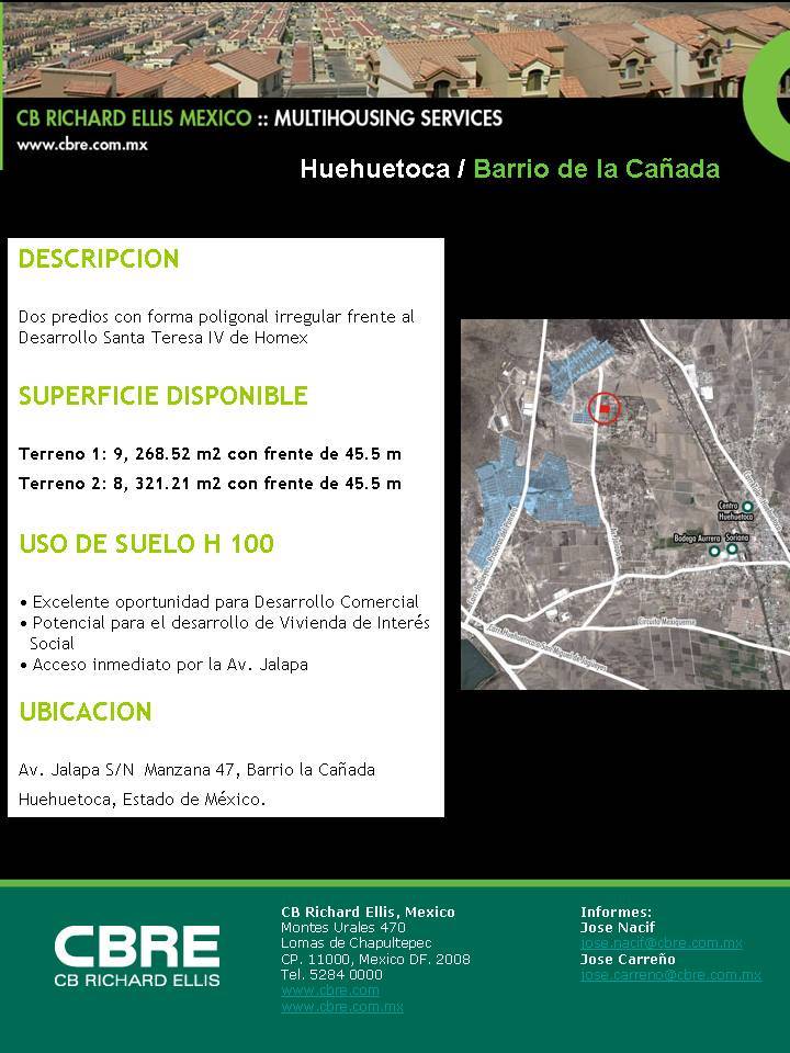 TERRENO DE 17589 M2, PLANO RECTANGULAR, USO DE SUELO, TODOS LOS SERVICIOS, FRENTE A CASAS HOMEX, La Guadalupana, Santa Teresa lll y lV, con mas de 100,000 VIVIENDAS YA HABITADAS, UBICADO EN LA AVE. JALAPA S/N , BARRIO LA CAÑADA, c.p. 54685 HUEHUETOCA ESTADO DE MEXICO. A SOLO 2 KM. DE LA CARRETERA A QUERETARO, MUY CERCA DEL ENTRONQUE DEL CIRCUITO MEXIQUENSE.TERRENO URBANIZADO Y ESCRITURADO. NO COMPRE RIESGOS! Uso de suelo de Habitacional H333A, que corresponde a maximo 6 niveles de altura o 16.50 sin incluir tinacos, sobre el desplante, ideal para condominios, alcanza para construir 180 viviendas por hectárea . Si se requiere un mayor uso de densidad, el terreno se podría vender en fracciones de 100m2 cada uno o bien CU 333 A para usos como:Manufacturera de textiles, Comercio para la venta , renta , deposito, reparación de vehículos y maquinaria en general, . Comercio de productos y servicios especializados, Comercio de materiales para construcción, Centro de espectáculos culturales y recreativos, Educación superior e instituciones de investigación, Instalaciones para la seguridad publica y Procuración de Justicia, Habilitación, Oficinas, Servicios financieros, Centros Comerciales, Hospitales y Sanatorios, Instalaciones religiosas, Instalaciones hoteleras, Funerarias y velatorios.